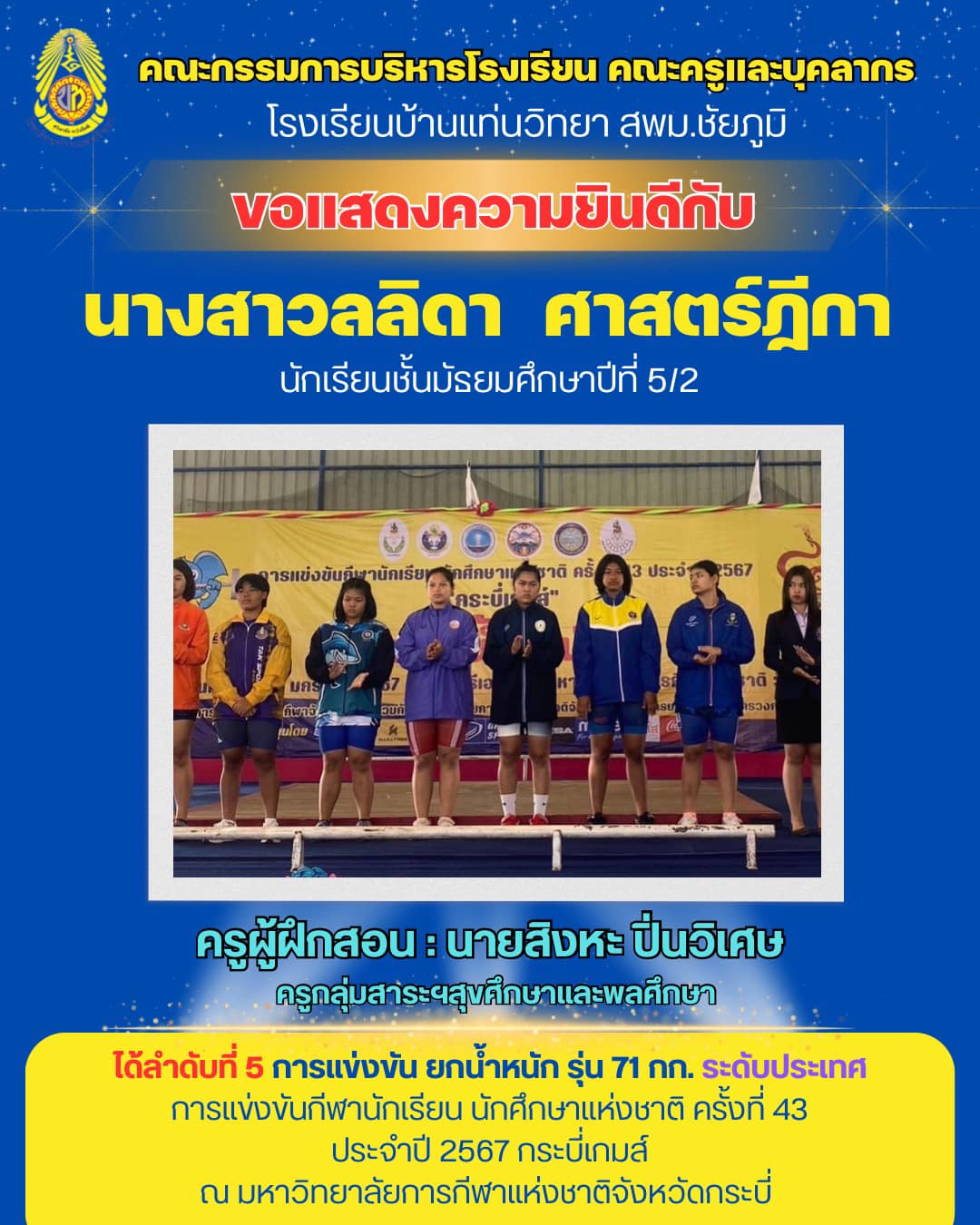 นางสาวลลิดา ศาสตร์ฎีกา นักเรียนชั้น ม.5/2 ได้ลำดับที่ 5 การแข่งขันยกน้ำหนัก รุ่น 71 กก. ระดับประเทศ