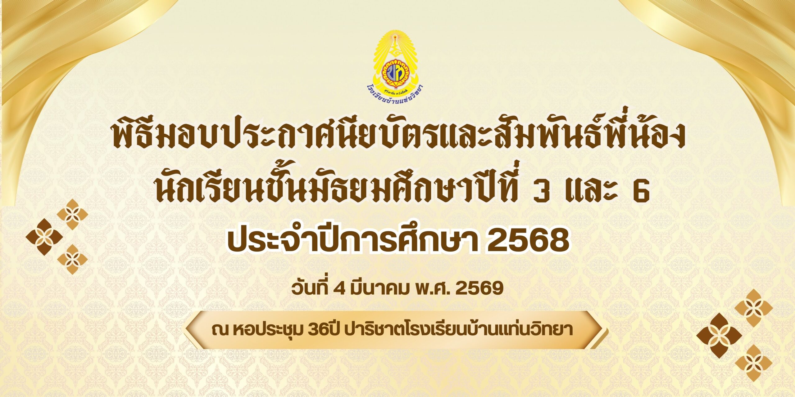 โรงเรียนบ้านแท่นวิทยา ได้จัดพิธีมอบประกาศนียบัตรและกิจกรรมสัมพันธิ์พี่น้อง ให้แก่นักเรียนชั้นมัธยมศึกษาปีที่ 3 และชั้นมัธยมศึกษาปีที่ 6 ประจำปีการศึกษา 2568 เมื่อวันที่ 4 มีนาคม พ.ศ. 2569 ณ หอประชุม 36 ปี ปาริชาต โรงเรียนบ้านแท่นวิทยา